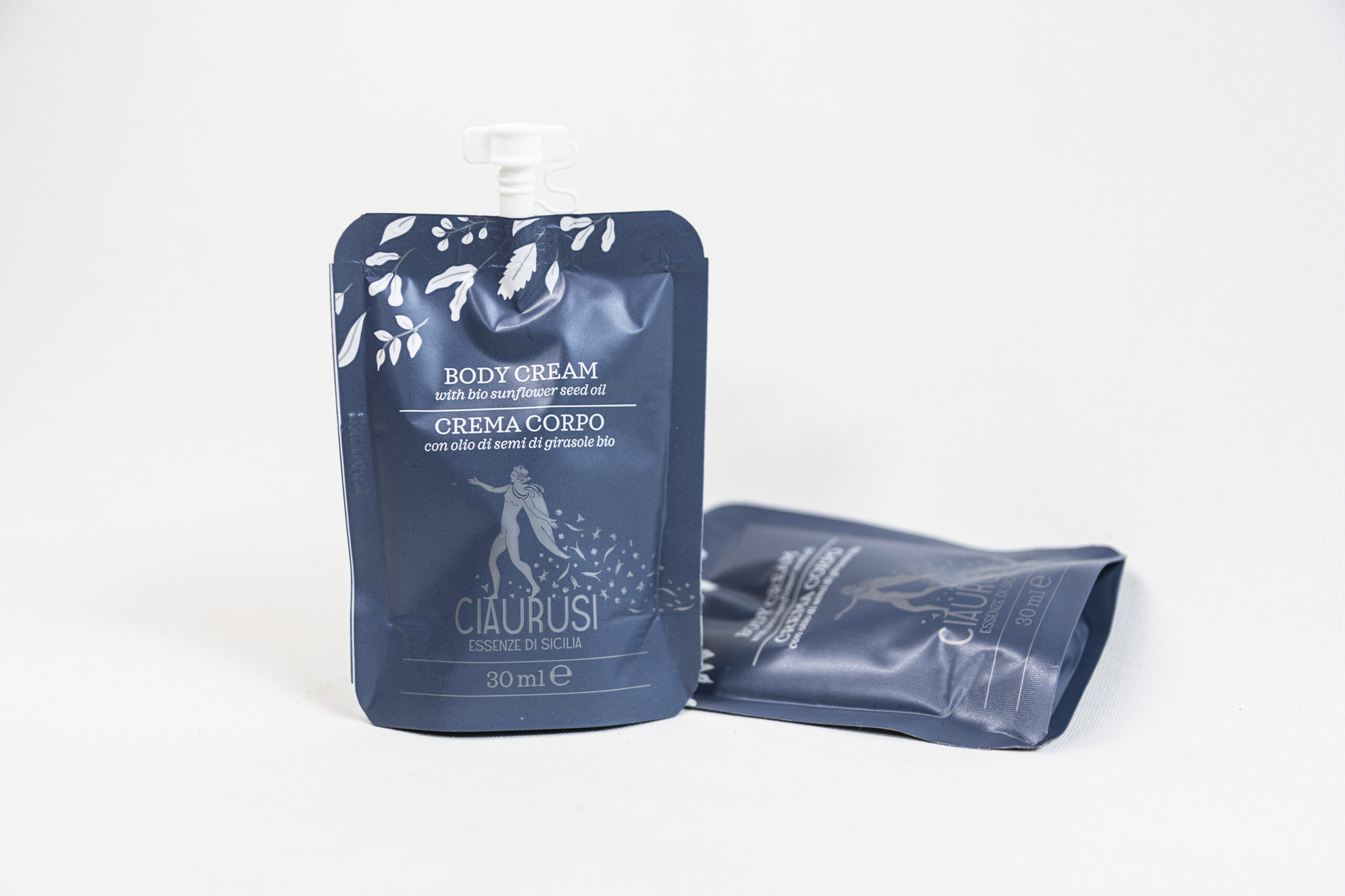 Crema corpo Aretusa in doypack con olio di semi di girasole bio , il doypack rispetta l’ambiente è totalmente riciclabile ed evita gli sprechi.